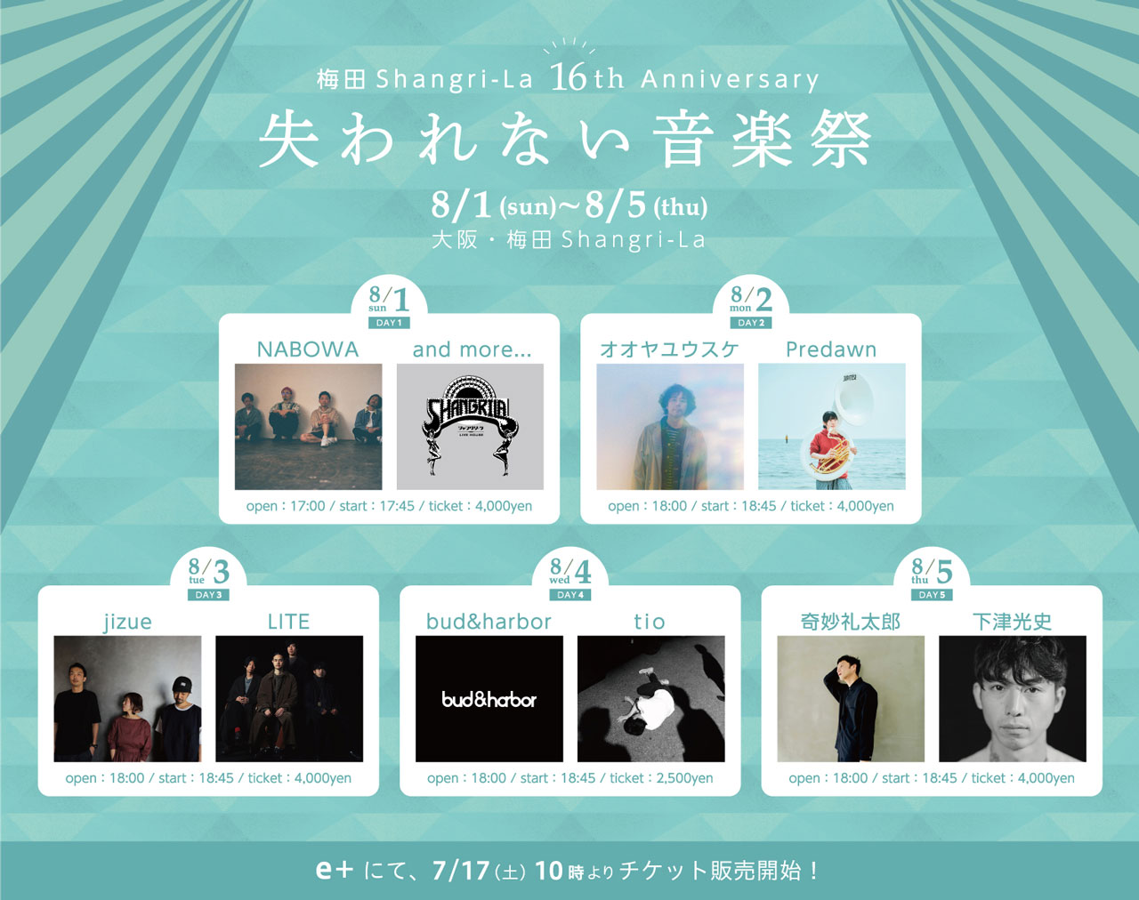 18 7月 2021 wac all, PAST SHOWS (SOLO) 2021-07-18 wac 2021.08.05(THU) 梅田シャングリラ 下津光史ソロ 梅田Shangri-La 16th Anniversary「失われない音楽祭 DAY5」 2021年08月05日(木) open18:00 start18:45 前売:¥4000【1drink¥600別】 ◆LIVE: 奇妙礼太郎 下津光史 *チケットはイープラスにて7月17日(土)10:00~発売開始! (問)梅田Shangri-La 06-6343-8601 シャングリラ オフィシャルサイト