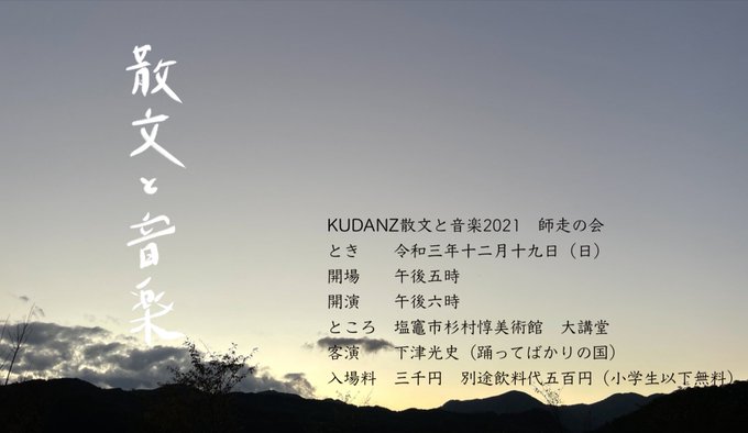 26 11月 2021 wac all, PAST SHOWS (SOLO) 2021-11-26 wac 2021.12.19(SUN) 宮城県 塩竈市 杉村惇 美術館 大講堂 下津光史ソロ KUDANZ 散文と音楽2021 師走の会 2021.12.19(日) 塩竈市 杉村惇 美術館 大講堂 ゲスト:下津光史(踊ってばかりの国) 開場:17:00 開演:18:00 入場料:3000円(D別500円)小学生以下無料 チケットの予約はこちら杉村惇 美術館 WEBSITE