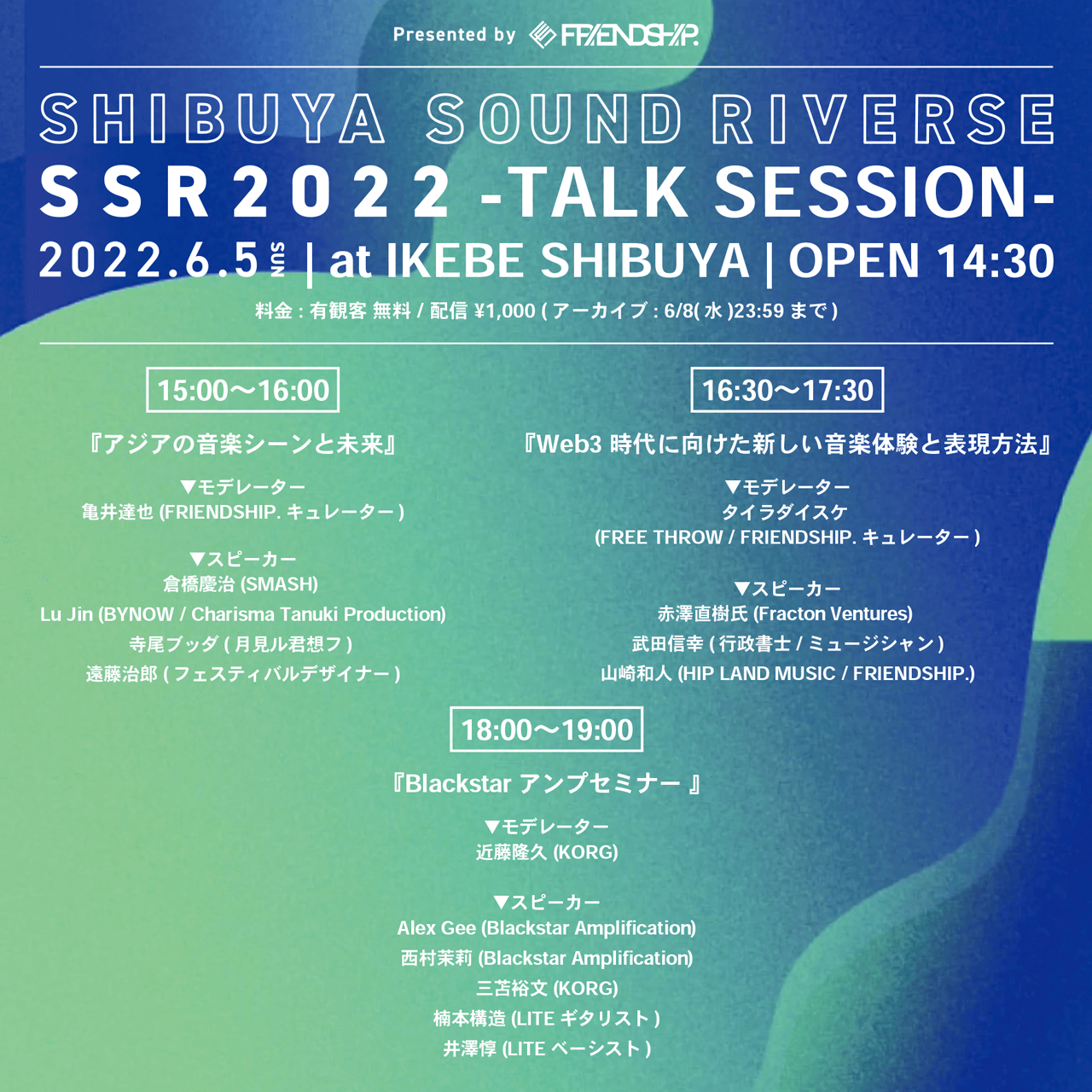 渋谷川が流れる再開発エリア「渋⾕リバーストリート」を挟んだ、STREAM HALL、SPACE ODD、CIRCUS TOKYO、IKEBE SHIBUYA、FS.の5会場で開催となり、FRIENDSHIP.でデジタルディストリビューションをサポートするアーティストのライブや、トークセッションなどのカンファレンスの開催も予定しております。