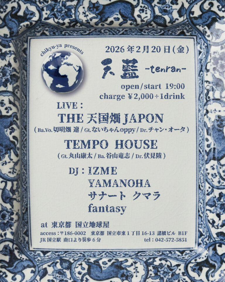 20 2月 2026 wac all, SOLO LIVE 2026-02-20 wac 2026.02.20(FRI)@国立 地球屋 谷山竜志 丸山康太 2/20(金) 国立 地球屋 -Live- The天国畑JAPON Ba.切明畑 遼 / Gt.ないちゃんoppy / Dr.チャン・オータ TEMPO HOUSE Gt.丸山康太 / Ba.谷山竜志 / Dr.伏見陵 -DJ- IZME / YAMANOHA / サナート クマラ / FANTASY OPEN 19:00 / START 19:30 CHARGE ¥2,000+1DRINK 地球屋ホームページはこちら