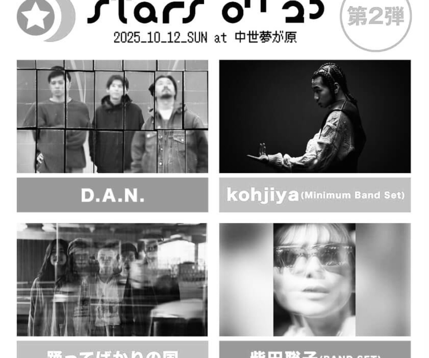 PAST SHOWS 19 7月 2025 2025.10.12SUN 【STARS ON 25 】岡山県 中世夢が原 【STARS ON25】踊ってばかりの国 / D.A.N. / Kohjiya(Minimum Band Set)/ never young beach / スチャダラパー / 柴田聡子(BAND SET) / STUTS / and… wac