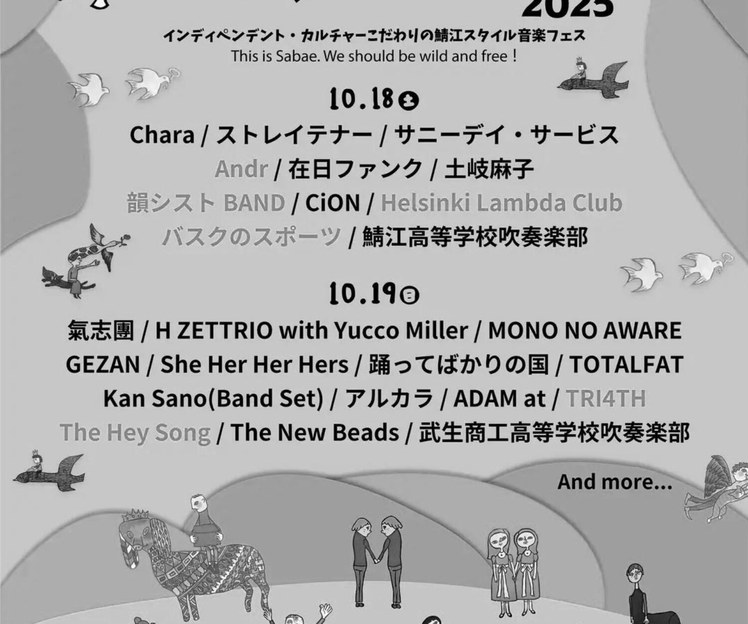 PAST SHOWS 19 7月 2025 2025.10.19.SUN 【鯖江JAZZフェスティバル2025 】福井県 【鯖江JAZZフェスティバル2025】踊ってばかりの国 / 氣志團 / H ZETTRIO with Yucco Miller / MONO NO AWARE /GEZAN / She Her Her Hers /… wac