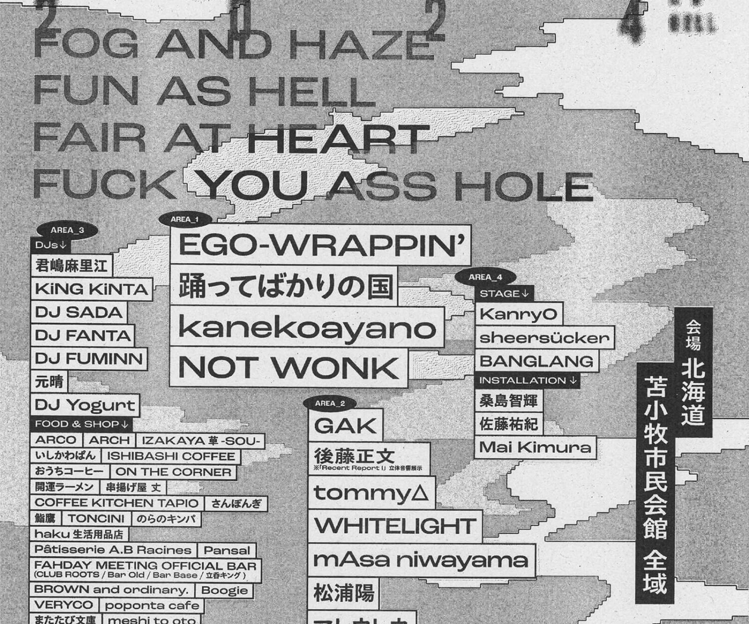 INFORMATION 19 9月 2024 加藤修平発案、 表現の交換市「FAHDAY2024」第四弾出演アーティストとして、NOT WONKと共に苫小牧を拠点とするアクトや写真家・桑島智輝の作品展示など全18組を発表。エリアマップも公開。 NOT WONK 加藤修平が発案者となり10月12日(土)地元北海道苫小牧で開催する、表現の交換市 “FAHDAY 2024”。その第四弾出演アーティストとエリアマップが発表・・・ wac