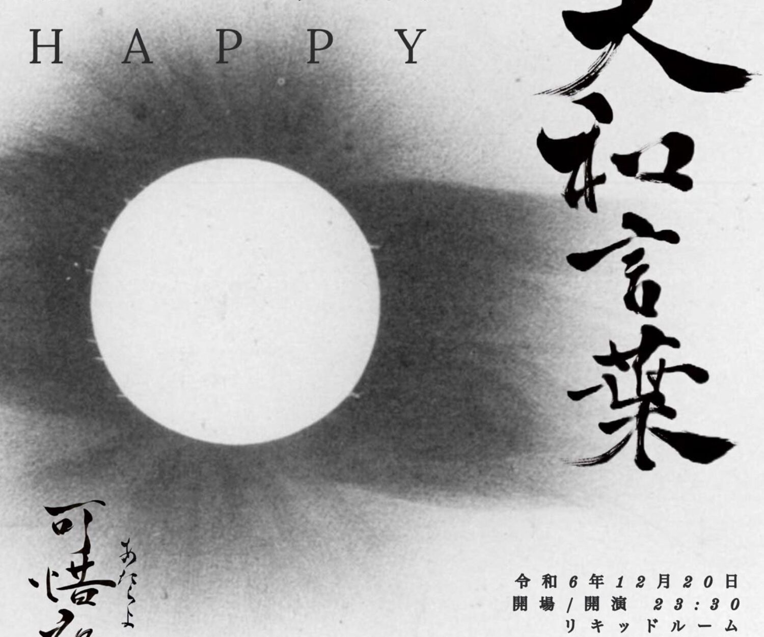 INFORMATION 23 11月 2024 踊ってばかりの国の自主企画スペシャル版「大和言葉-可惜夜-」開催決定。 対バンにHAPPYが出演。 「大和言葉-可惜夜-」というタイトル通り当日はオールナイト公演となり恵比寿LIQUIDROOMに加えてTime Out Café & Diner、LIQUID LOFTも使ってイベントが行われる。今後バンド以外の出演者も追加発表される予定となっている。 wac