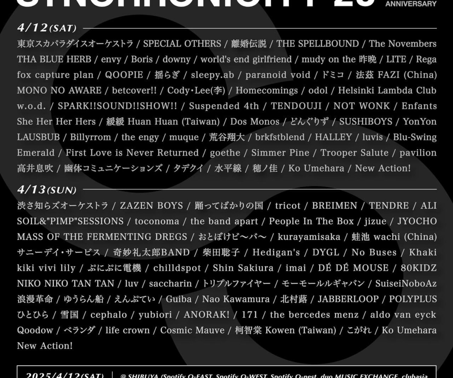 INFORMATION 10 3月 2025 【3/10 情報更新】SYNCHRONICITY’25 タイムテーブル公開 踊ってばかりの国、今年も『SYNCHRONICITY’25 - 20th Anniversary!! -』出演が決定。タイムテーブル公開されました。踊ってばかりの国は、4/13(日)出演・・・ wac