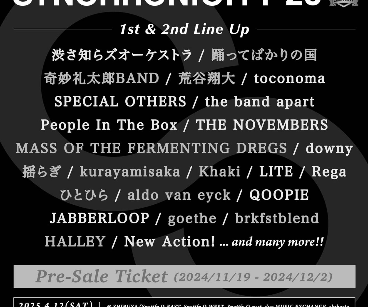PAST SHOWS 22 3月 2025 【2025.04.12.SUN-13.SAT】 SYNCHRONICITY’25 @渋谷 【SYNCHRONICITY’25 - 20th Anniversary!! -】踊ってばかりの国 / 奇妙礼太郎BAND / 荒谷翔大 / MASS OF THE FERMENTING DREGS / 揺らぎ / kurayamisaka /… wac