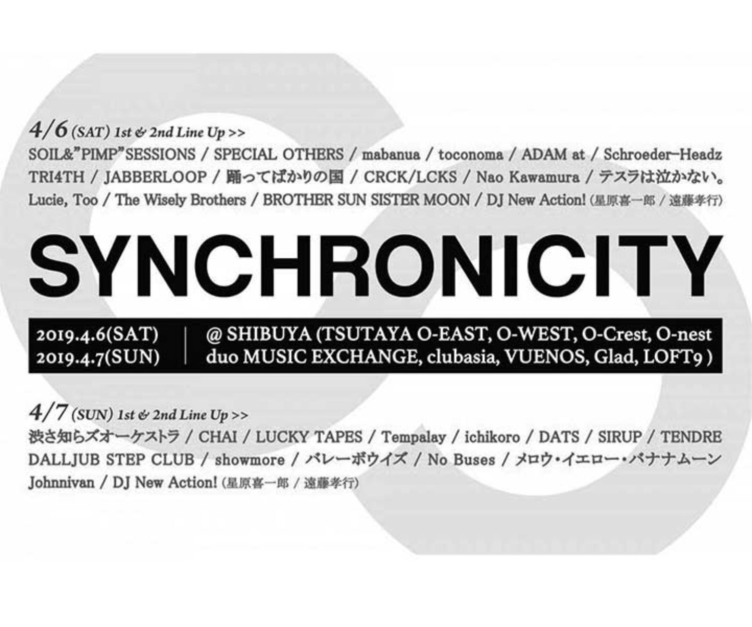 all, INFORMATION, PAST SHOWS 10 1月 2019 2019.04.06(SAT)『SYNCHRONICITY’19』 TSUTAYA O-EAST、TSUTAYA O-WEST、TSUTAYA O-Crest、TSUTAYA O-nest、duo MUSIC EXCHANGE、clubasia、VUENOS、Glad、LOFT9(東京・渋谷) wac