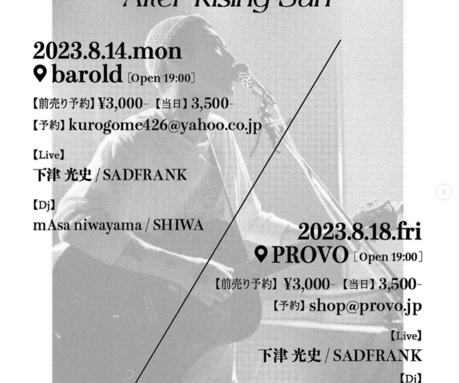 all, PAST SHOWS (SOLO) 21 7月 2023 2023.08.14.MON-18.FRI 下津光史ソロ 北海道Grass Fed Tour 2023 【Grass Fed Tour 2023】8/14(月)苫小牧 Bar Old・8/16(水)帯広 Flower Rock・8/18(金)札幌 PROVO / 下津光史 & many DJs wac